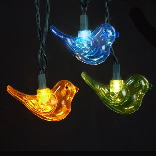 Indoor/outdoor.30-inch lead wire.Total of 10 lights.12-Inch spacing. This Kurt Adler 10-Light Bird Light Set is a fun, festive way to add to your home or theme party décor Each light in this indoor/outdoor set features a small perched bird in either a vibrant blue, yellow, green, or pink. Each set has a 30-Inch lead wire, 12-Inch spacing, and no end connector.